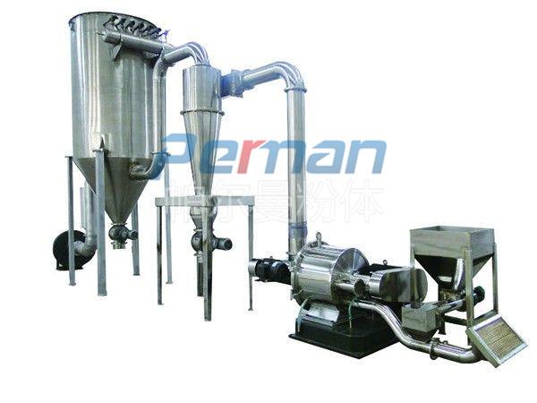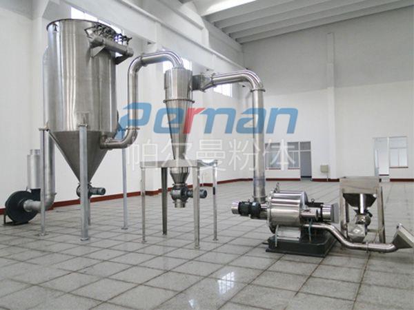 物料由加料系統(tǒng)均勻的送入粉碎室受到高速旋轉(zhuǎn)的粉碎盤的強(qiáng)烈沖擊,同時(shí)受到離心力的作用,與粉碎齒圈發(fā)生碰撞,受到剪切、摩擦、碰撞等多種綜合力的作用,使物料粉碎,被粉碎的物料隨氣流運(yùn)動(dòng)到分級區(qū),通過變頻調(diào)節(jié)的分級輪,對粗細(xì)物料進(jìn)行分離,符合細(xì)度要求的產(chǎn)品隨氣流進(jìn)入旋風(fēng)收集器和除塵器收集,粗物料返回分級區(qū)二次粉碎。
