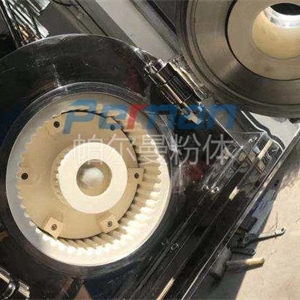 CAM-S雙軸陶瓷粉碎機工作運轉(zhuǎn)中物料由加料系統(tǒng)均勻的送入粉碎室受到高速旋轉(zhuǎn)的粉碎盤的強烈沖擊,同時受到離心力的作用,與粉碎齒圈發(fā)生碰撞,受到剪切、摩擦、碰撞等多種綜合力的作用,使物料粉碎,被粉碎的物料隨氣流運動到分級區(qū),通過變頻調(diào)節(jié)的分級輪,對粗細(xì)物料進行分離,符合細(xì)度要求的產(chǎn)品隨氣流進入旋風(fēng)收集器和除塵器收集,粗物料返回分級區(qū)二次粉碎。