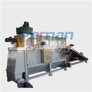 篩分裝置:篩分裝置中滾筒篩壁面布滿篩孔,篩板表面固定有可活動的6塊斜板,此斜板起到內(nèi)螺旋的作用。廢袋和物料進(jìn)入滾筒篩內(nèi),滾筒篩低速旋轉(zhuǎn),加速物料透過篩孔落入錐斗內(nèi),廢袋由滾筒篩內(nèi)螺旋輸送到滾筒出口,并掉落到廢袋輸送機內(nèi)。