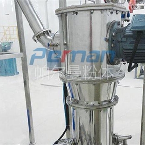 MQW流化床氣流粉碎機粉碎后的物料被上升的氣流輸送至葉輪分級區內,在分級輪離心力和風機抽力的作用下,實現粗細粉的分離,粗粉根據自身的重力返回粉碎室繼續粉碎,合格的細粉隨氣流進入旋風收集器,微細粉塵由袋式除塵器收集,凈化的氣體由引風機排出。